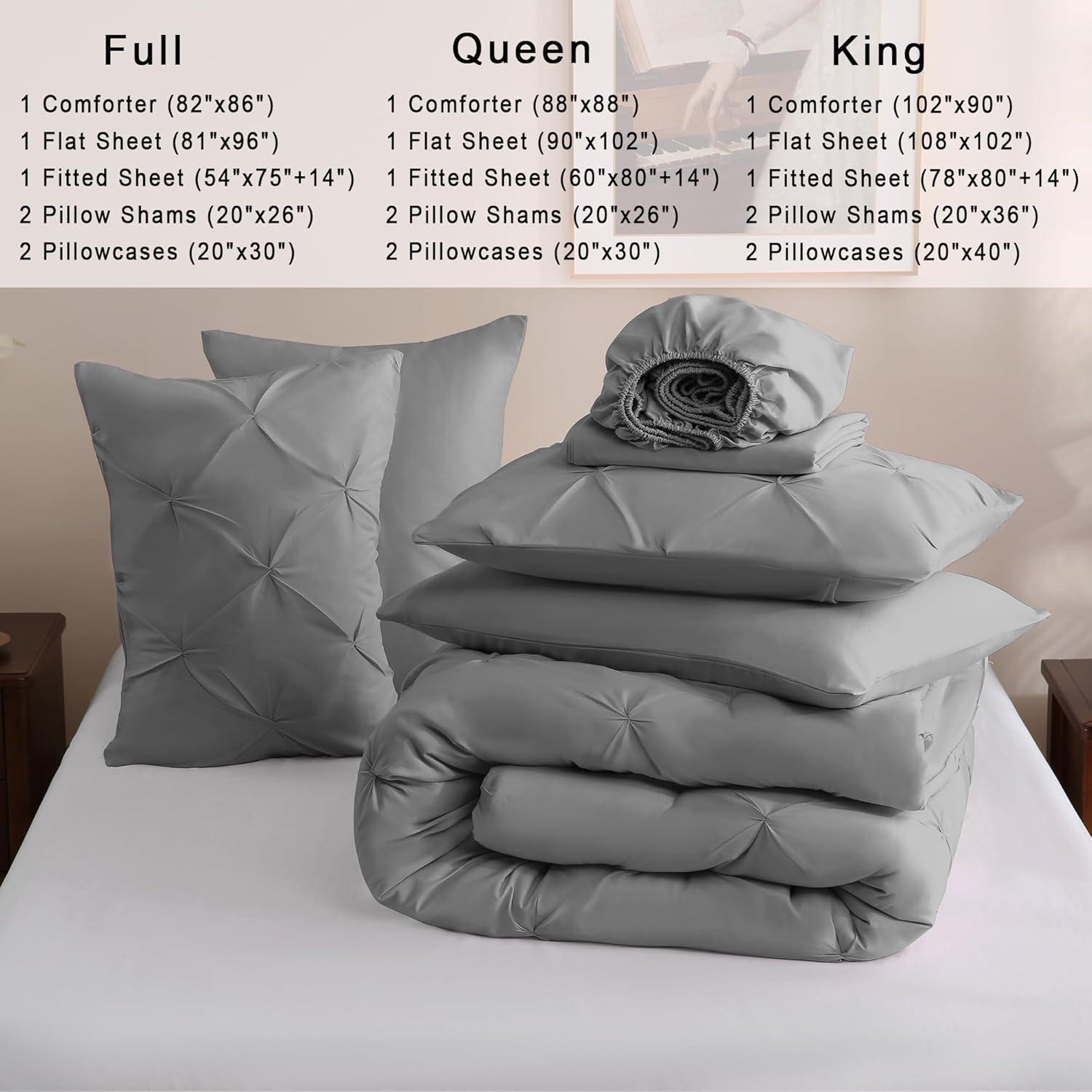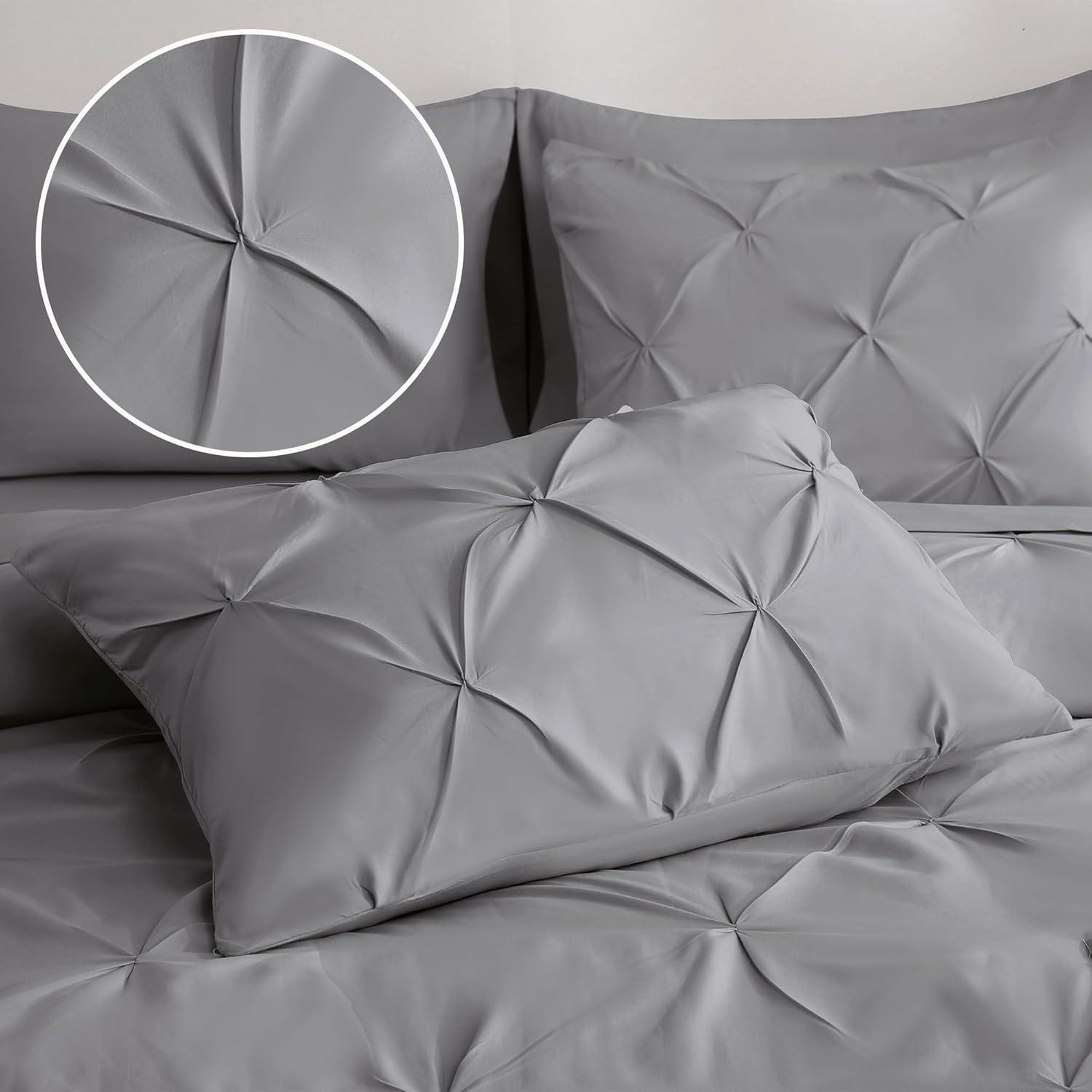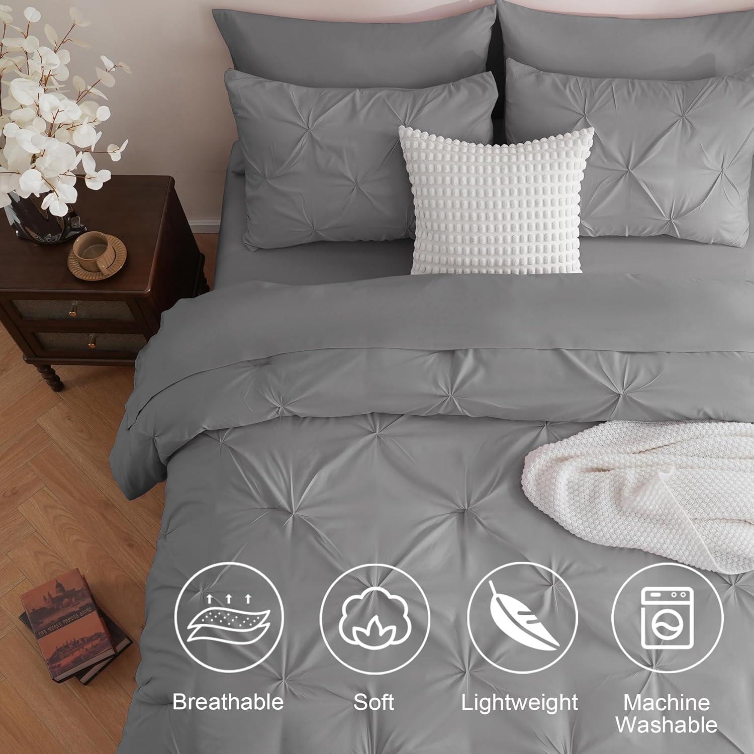 DOWNCOOL 7 Pieces Grey Queen Comforter Set, Pintuck Bed in A Bag Queen, Pinch Pleat Bed Set, Soft Microfiber All Season Bedding Set with Sheets, Pillowcases & Shams(Grey)