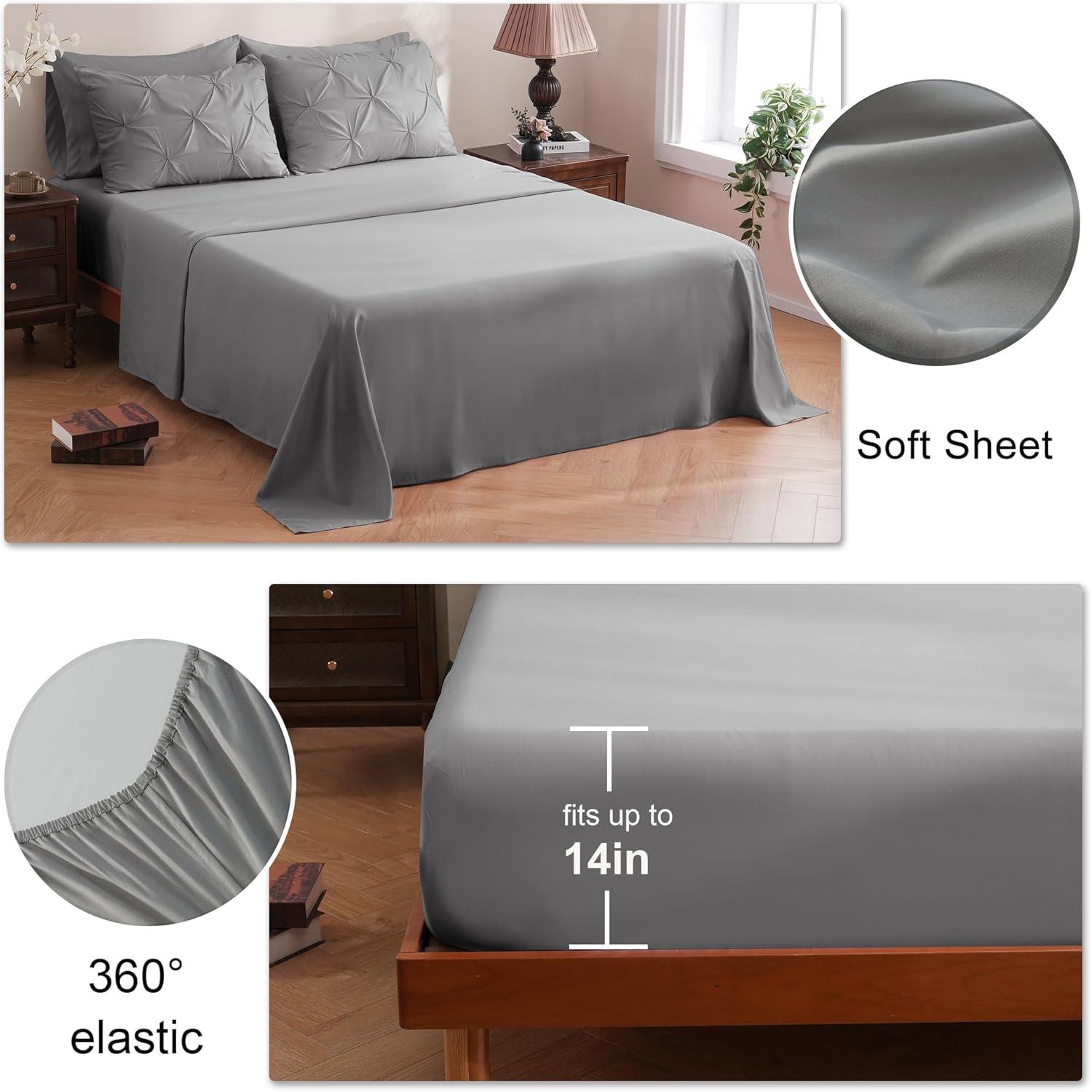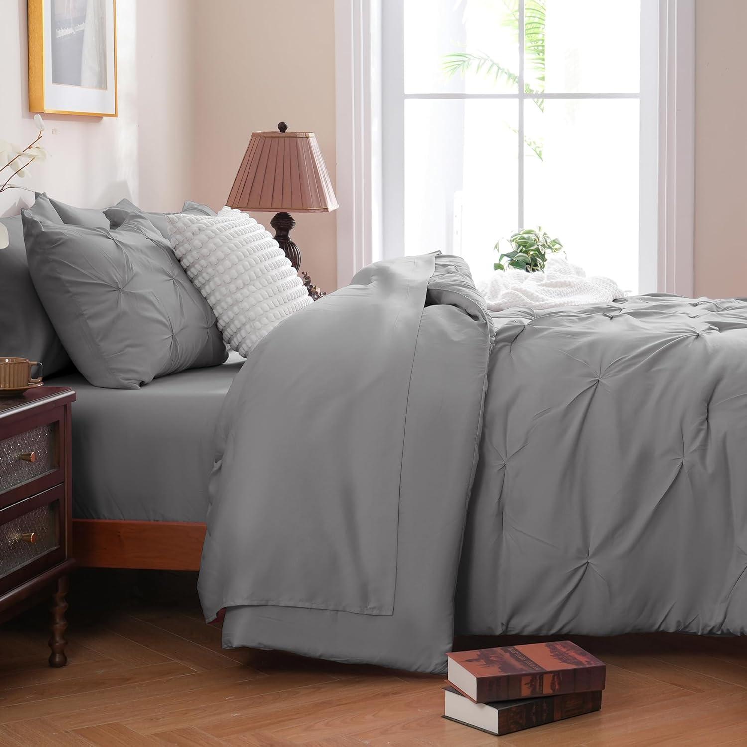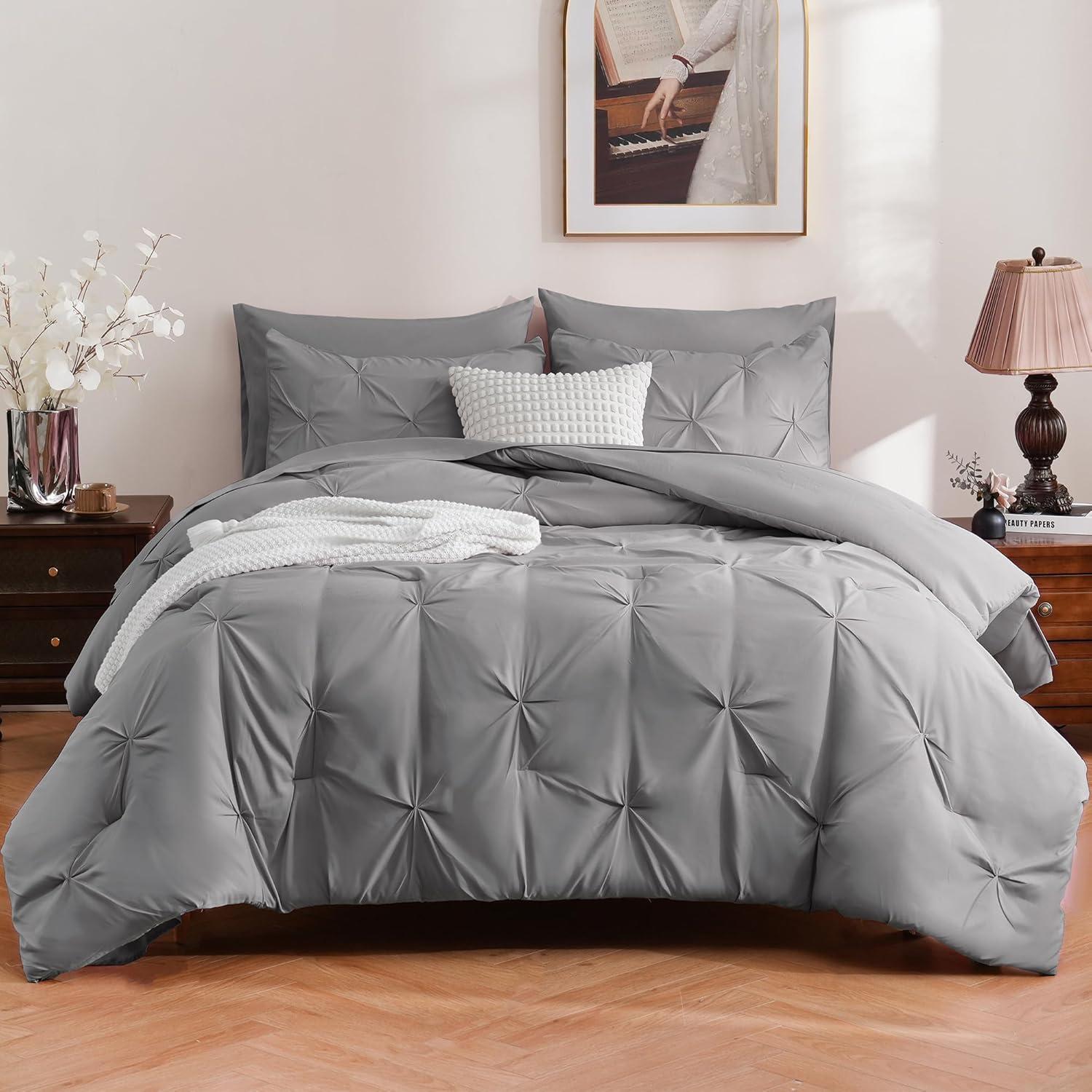 DOWNCOOL 7 Pieces Grey Queen Comforter Set, Pintuck Bed in A Bag Queen, Pinch Pleat Bed Set, Soft Microfiber All Season Bedding Set with Sheets, Pillowcases & Shams(Grey)