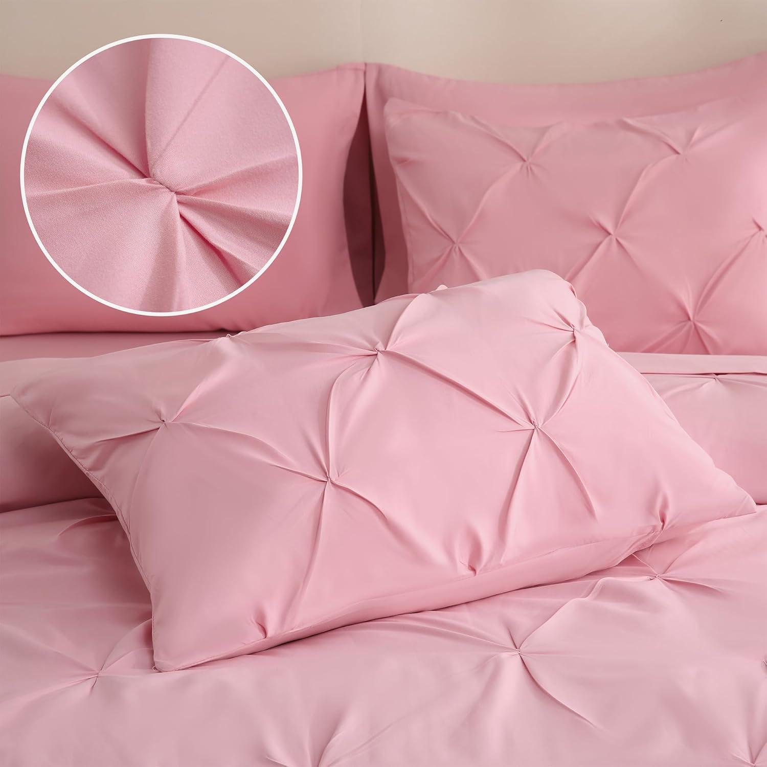 DOWNCOOL 7 Pieces Grey Queen Comforter Set, Pintuck Bed in A Bag Queen, Pinch Pleat Bed Set, Soft Microfiber All Season Bedding Set with Sheets, Pillowcases & Shams(Pink)