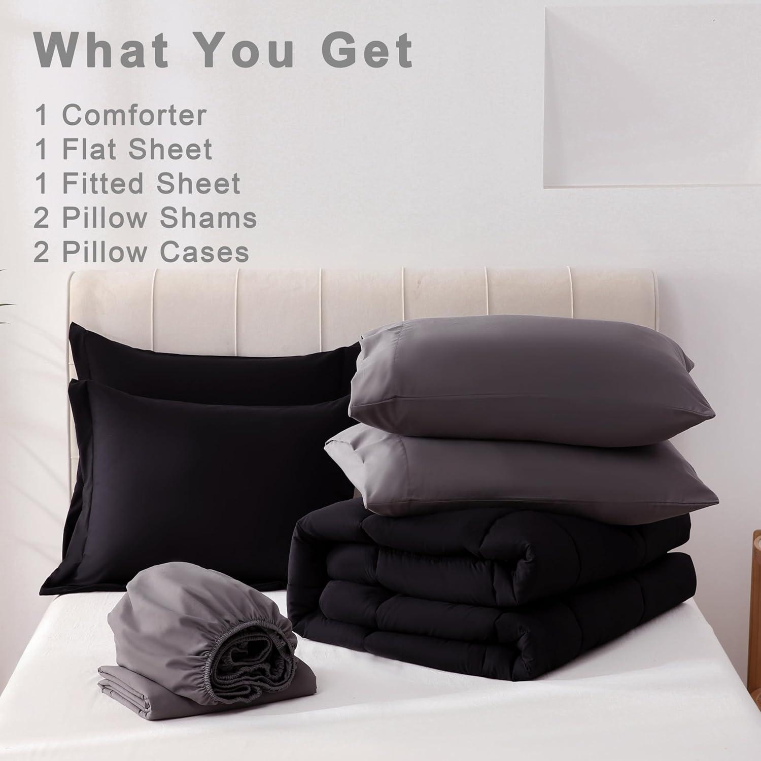 DOWNCOOL Queen Comforter Set, 7Pcs Bedding Sets Queen Purple, All Season Down Alternative Bed in a Bag Queen with Comforter, Flat Sheet, Fitted Sheet, 2 Pillow Shams & 2 Pillowcases(Black/Grey)